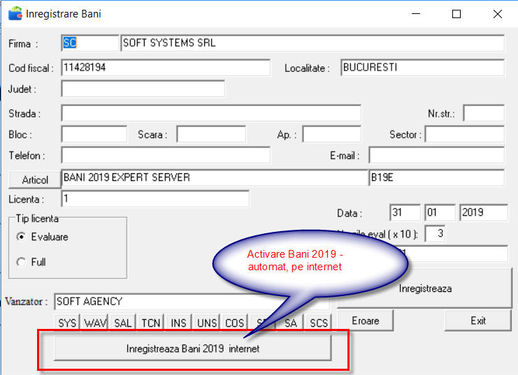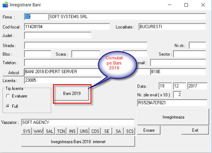 Dupa ce s-a actualizat la versiunea v.118, accesati meniul Inregistrare -> Panou Administrator - in partea de jos apare butonul Bani 2019 il apasati si programul va intra in evaluare pe noua versiune. Anumite functii vor deveni active numai dupa confirmarea platii, cand veti primi si inregistrarea definitiva a sistemului.