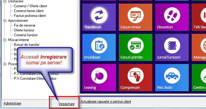 Dupa actualizarea programului, accesati link-ul "Inregistrare" din partea stanga - jos a ecranului principal, numai pentru calculatorul declarat ca server: